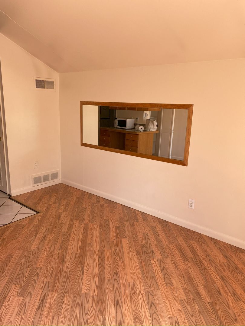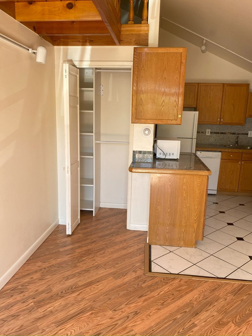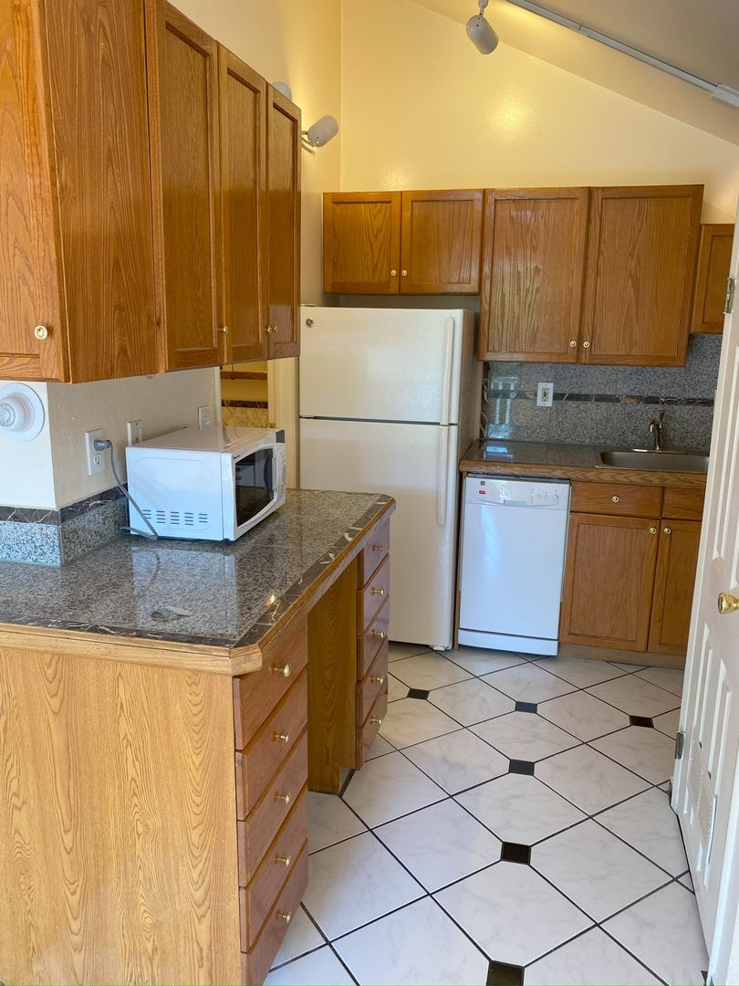 This remodeled studio with a spacious loft features a private balcony, marble tile, laminate wood flooring, oak cabinets, and granite countertops.