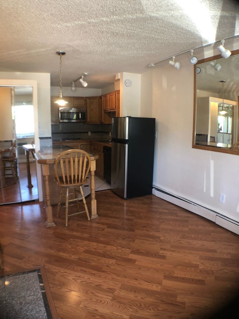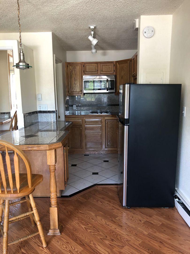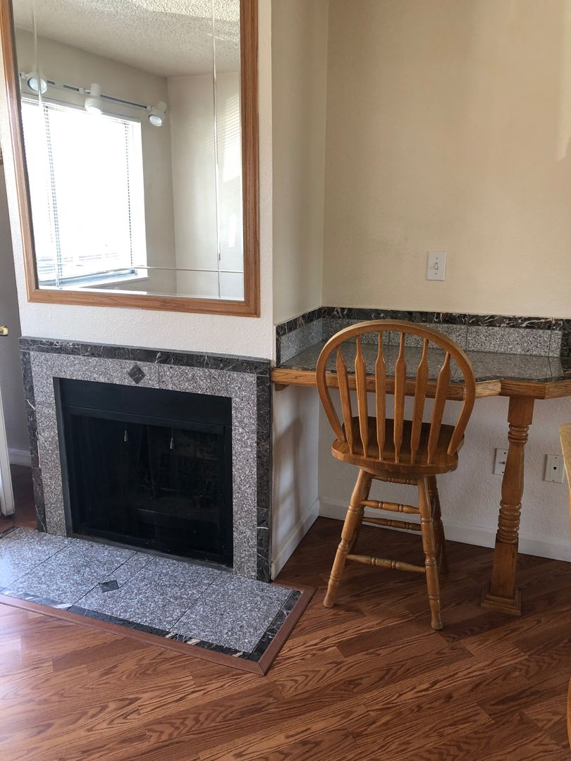 Remodeled studio with GRANITE countertops, real wood cabinets, laminate WOOD flooring, wood burning FIREPLACE, marble tile, and modest, just-what-you-need kitchen.