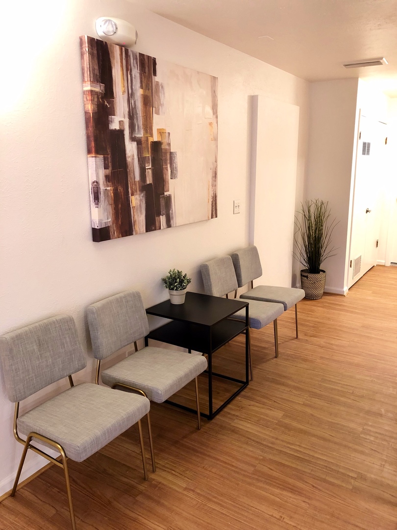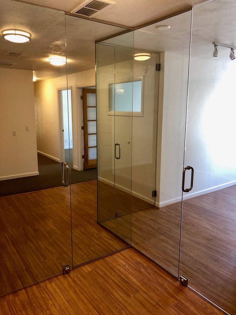 This suite has multiple offices (some with balconies) with prices starting at $495/month. There are multiple bathrooms (one with a shower), a shared waiting area and kitchenette. This suite also has two entry doors, one from the main building lobby and one from the parking lot.
