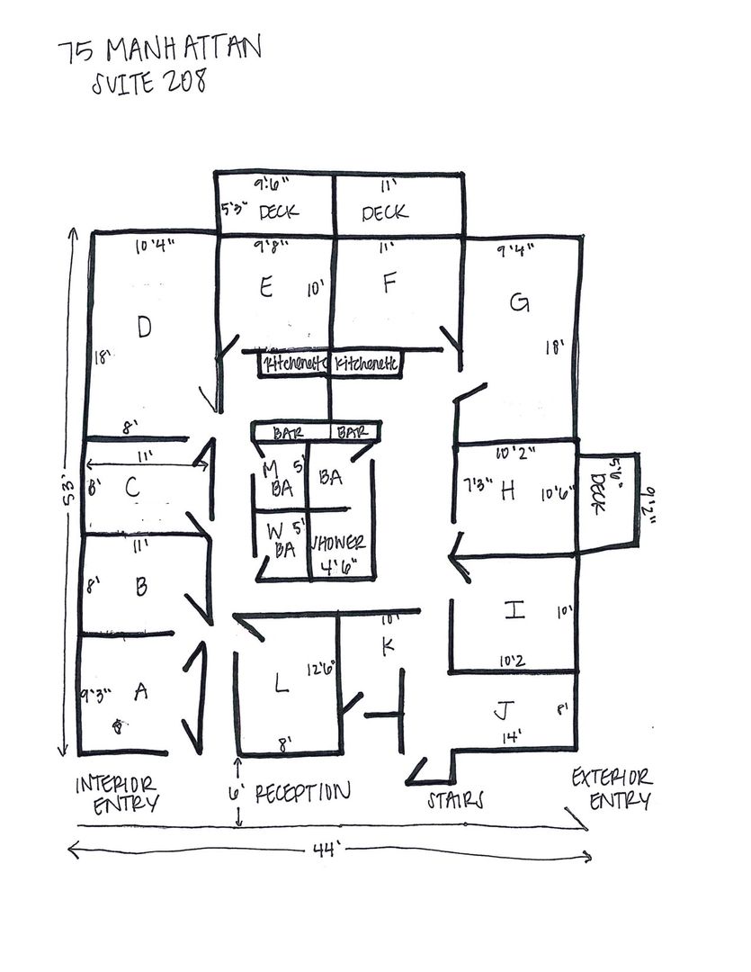 Office F includes a private balcony. There are two shared bathrooms in the Suite (one with a shower), a shared waiting area and shared kitchenette. This Suite has two entry doors, one from the main building lobby and one from the parking lot.